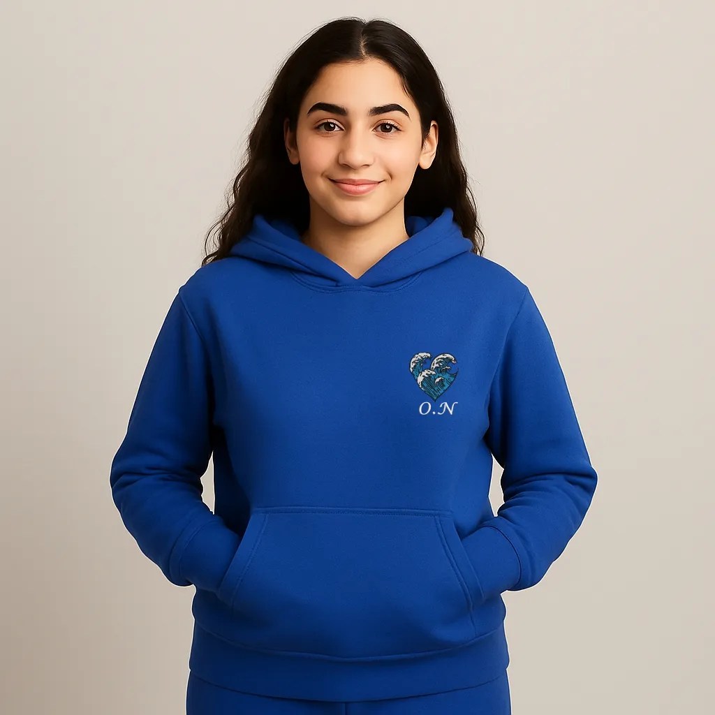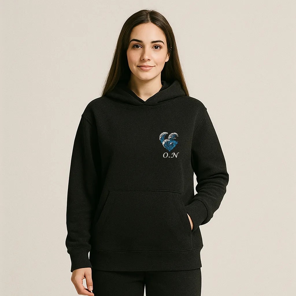 تصميم بسيط وأنيق يجمع بين الهدوء والرقي. مطبوع او مطرز عليه قلب بأمواج البحر مع إمكانية تخصيص أول حرفين من اسمك بأسلوب أنيق.