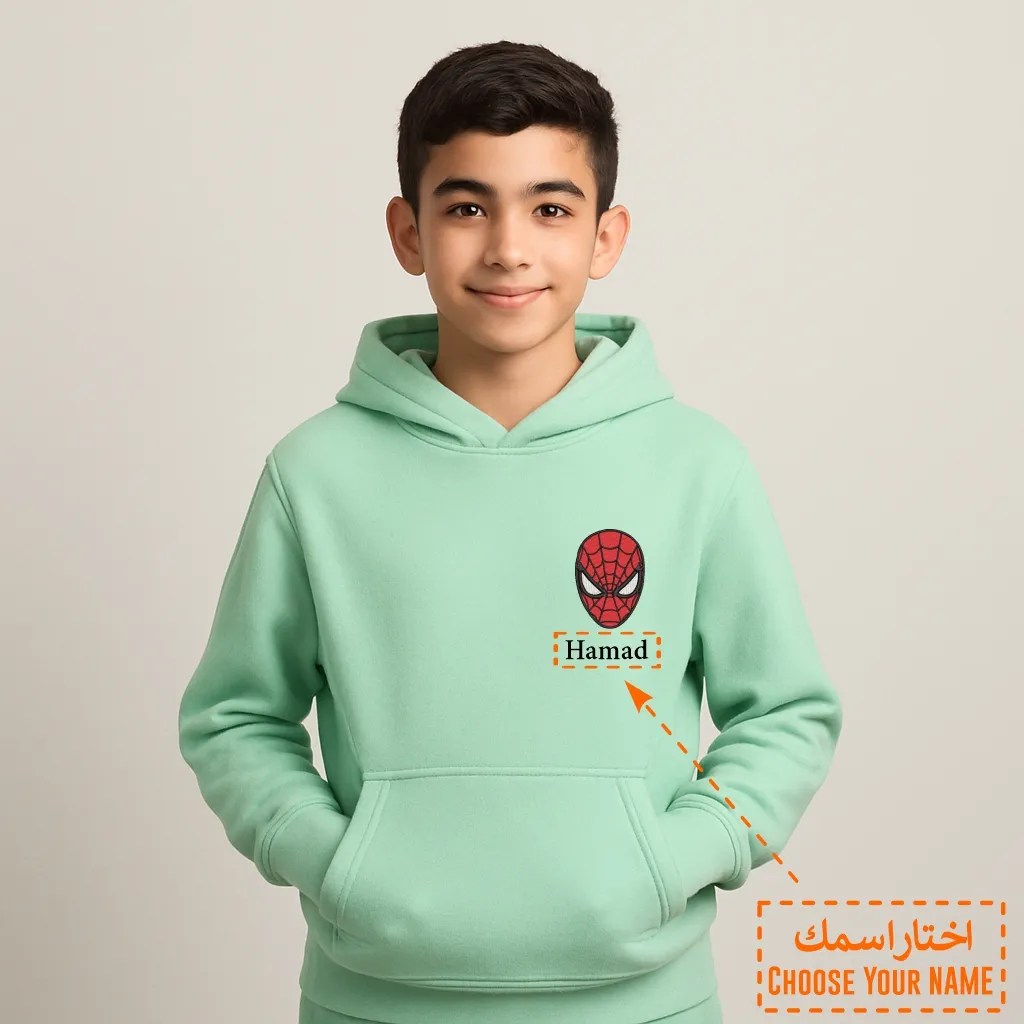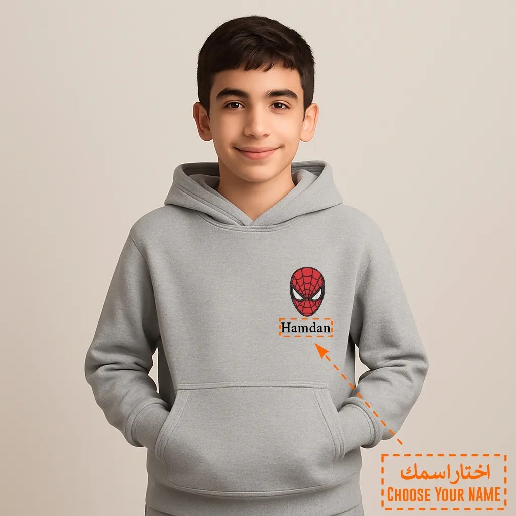 تميّز بإطلالة راقية ومريحة مع هودي أنيق مزين بتطريز فاخر ماسك سبيدر مان على الصدر. تصميم يجمع بين البساطة والهوية، مثالي لأيام المدرسة، الطلعات أو الهدايا.