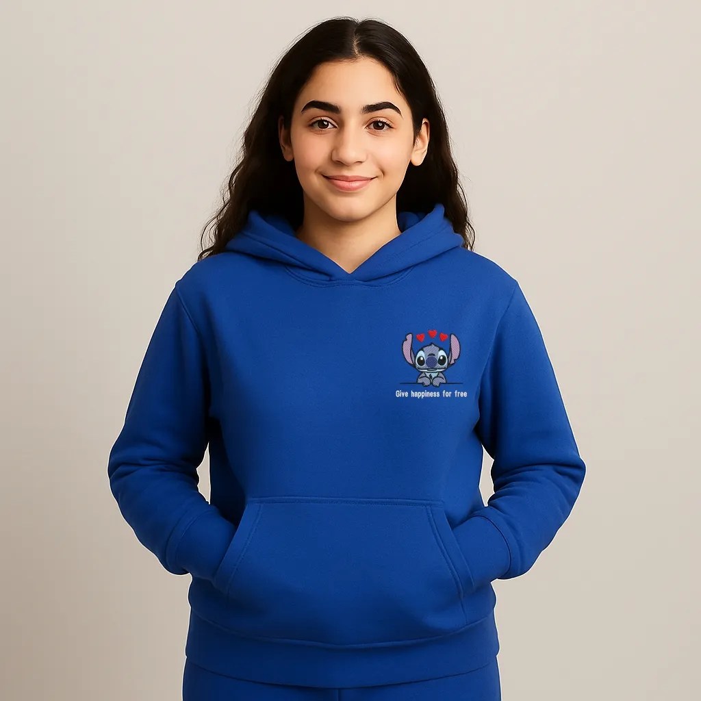 خليك دايمًا مميز مع هودي شخصية Stitch اللطيفة! تصميم بسيط وناعم على الجهة الأمامية مع إمكانية تخصيص الشعار بطباعة أو تطريز حسب اختيارك.